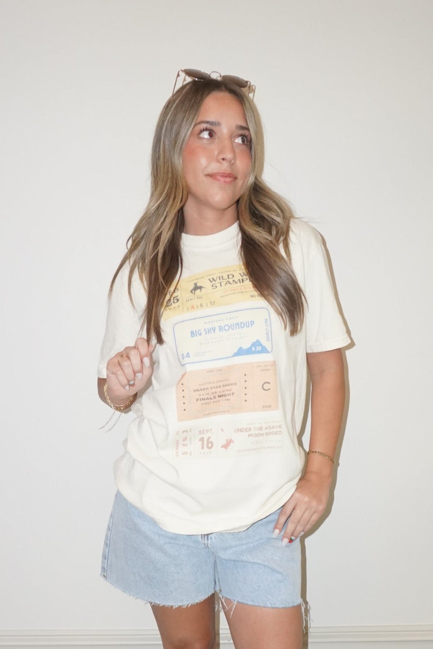 The Backstage Babe Tee isn’t just a top—it’s a whole mood. With vintage-style ticket graphics that scream “I’ve been on the list since way before it was cool,” it’s giving VIP access to all things effortlessly cool and a little bit country. The soft, worn-in feel makes it perfect for throwing on before a concert, a road trip, or just pretending you're side-stage with a cold drink and all-access credentials. Pair it with denim, boots, or a bandana if you’re really feeling bold—and get ready for everyone to ask where you got it. Because who needs a wristband when your outfit says it all?