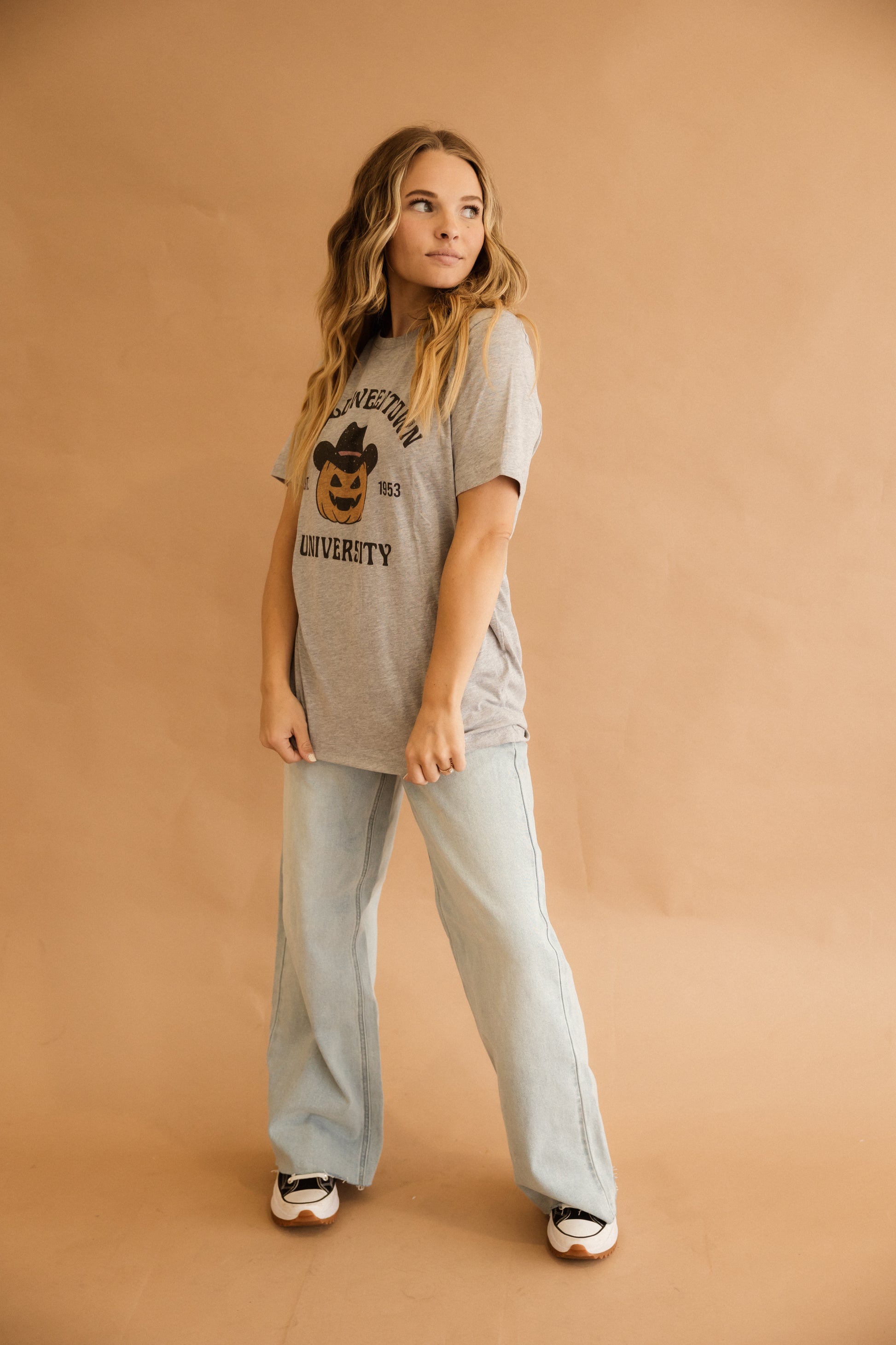 Halloweentown University cowboy tee, true to size. Size up for oversized fit. Jodi is wearing a large.