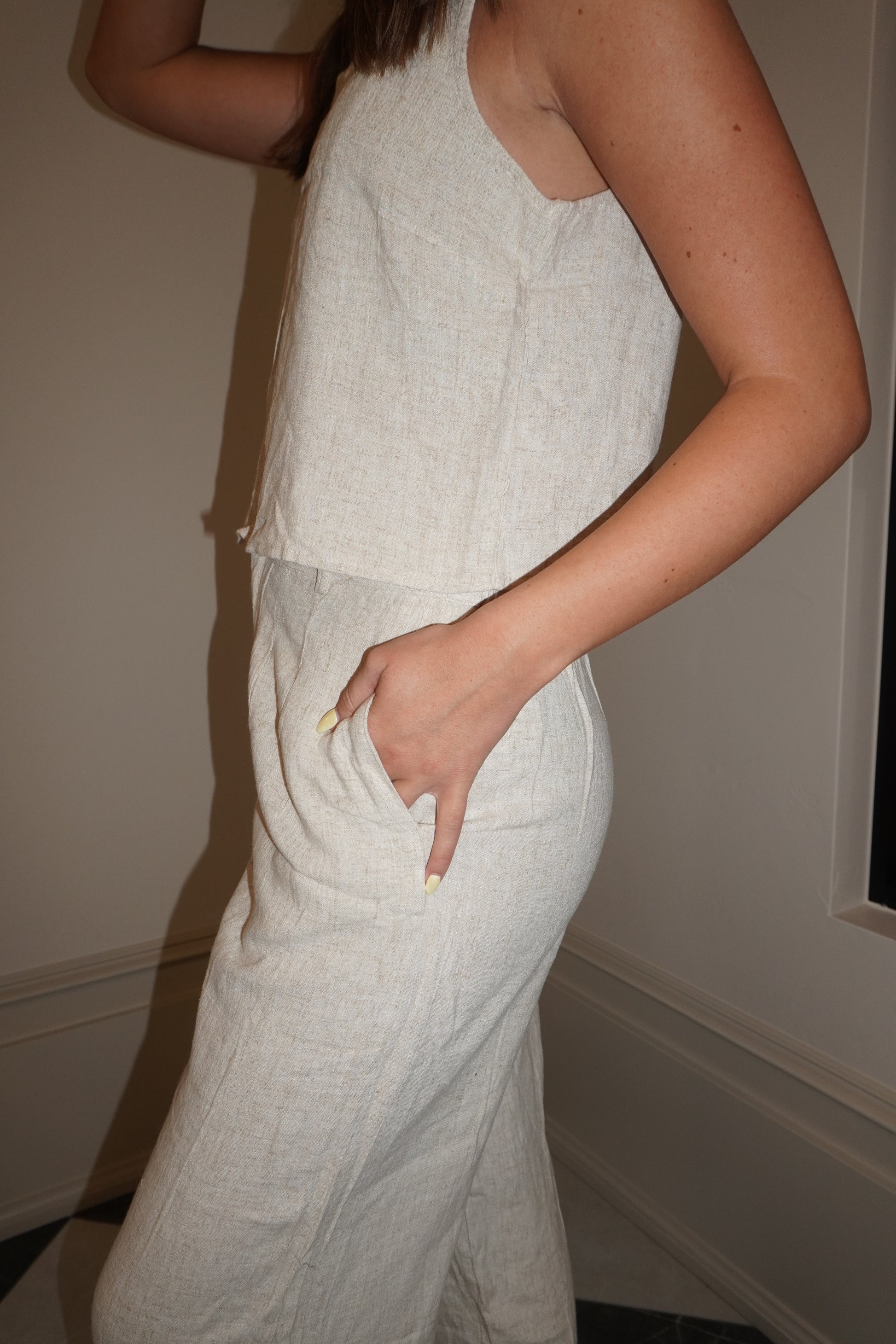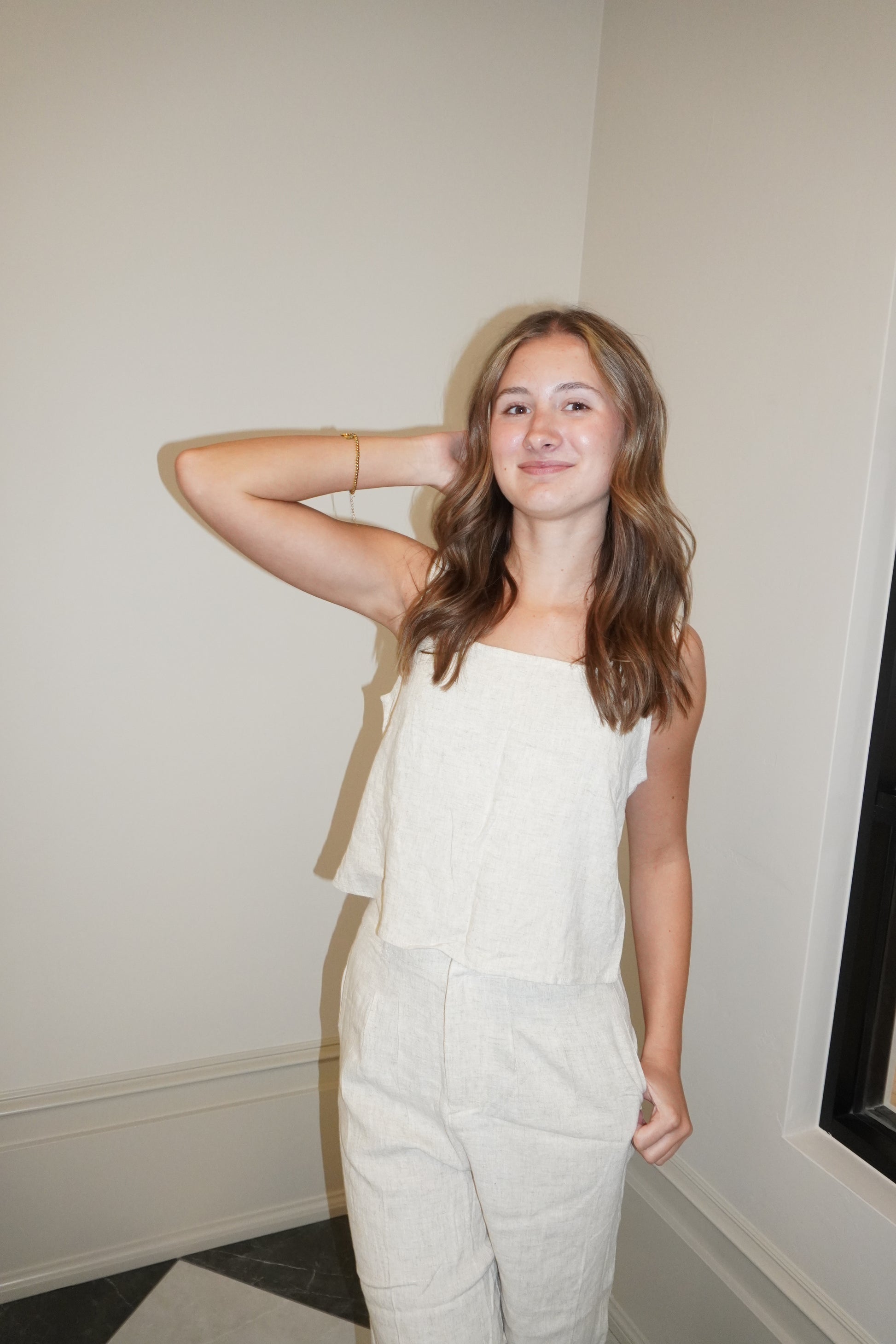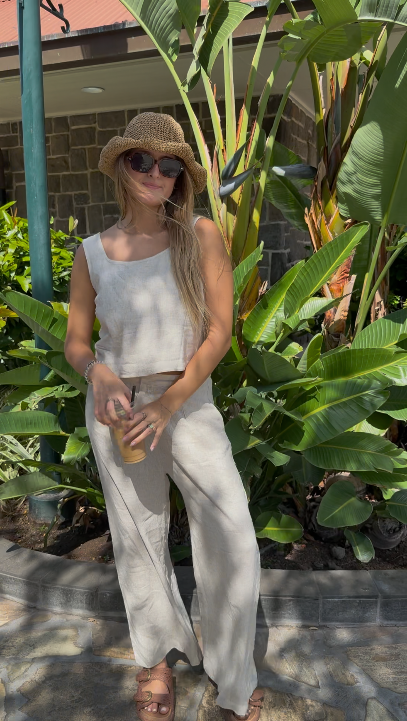 Meet the Haupia Tank—your new go-to for effortless cool that’s light, luxe, and just structured enough to feel polished. With thick straps, a boxy cropped fit, and a textured speckled cream fabric, it’s the kind of top that looks just as good with matching trousers as it does tossed over your favorite denim. Structured enough to dress up, relaxed enough to chill out. Basically, it’s doing the most while feeling like the least!