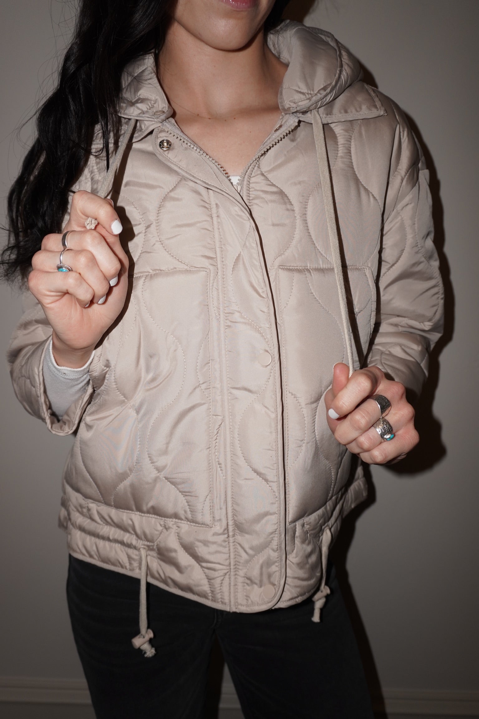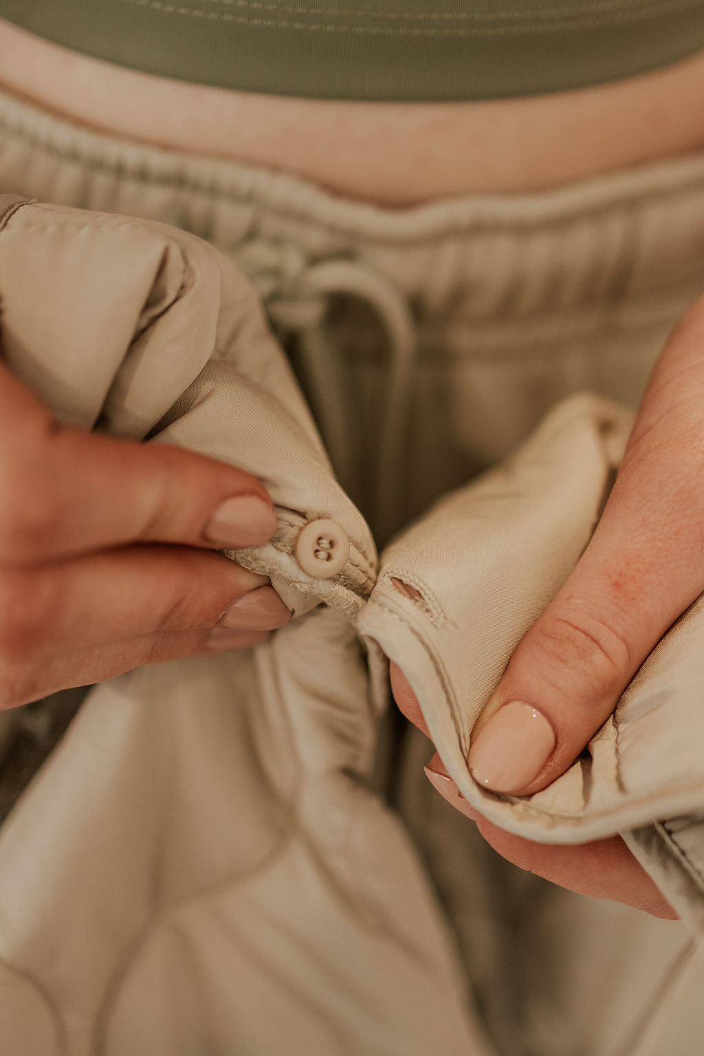 Meet the jacket that does it ALL—because why choose between style and function when you can have both? This cream quilted beauty features a zip-and-button closure for extra coziness, a removable hood for those *fashion over forecast* days, and an adjustable waist so you can cinch it in or keep it relaxed. Oh, and the pockets? They *actually* work. Whether you're braving the chill or just perfecting your effortlessly layered look, the Cozy on Up Jacket is your go-to for warmth, style, and keeping compliments on repeat. Paired here with our Juniper Workout Tank and Frostwork Sweatpants.