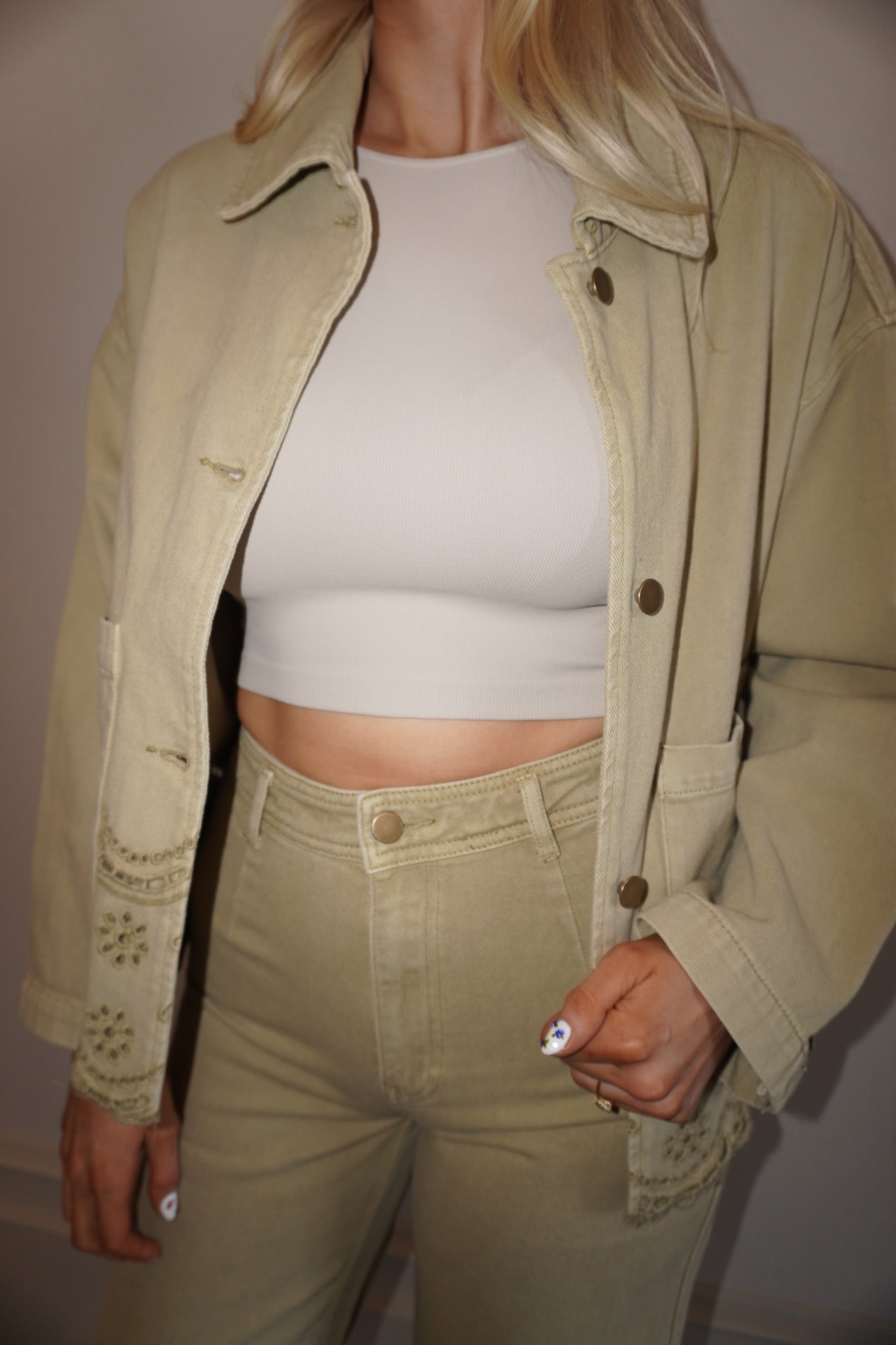 Sold separately, but destined to be paired with sunshine and your favorite snacks. This one’s for the girls who show up to the picnic looking like the main event. The Olive The Details Jacket is a structured, collared cutie in rich olive denim with deep front pockets (perfect for stashing sunnies, snacks, or secrets). Button it up for a clean look, or wear it open and let the outfit do the flirting. The real showstopper? The chic little cutouts on the cuffs—because details matter, even when you're lounging under the sun with a baguette in hand. Pair it with the matching flares or toss it over a dress—either way, it’s giving picnic, but make it fashion!