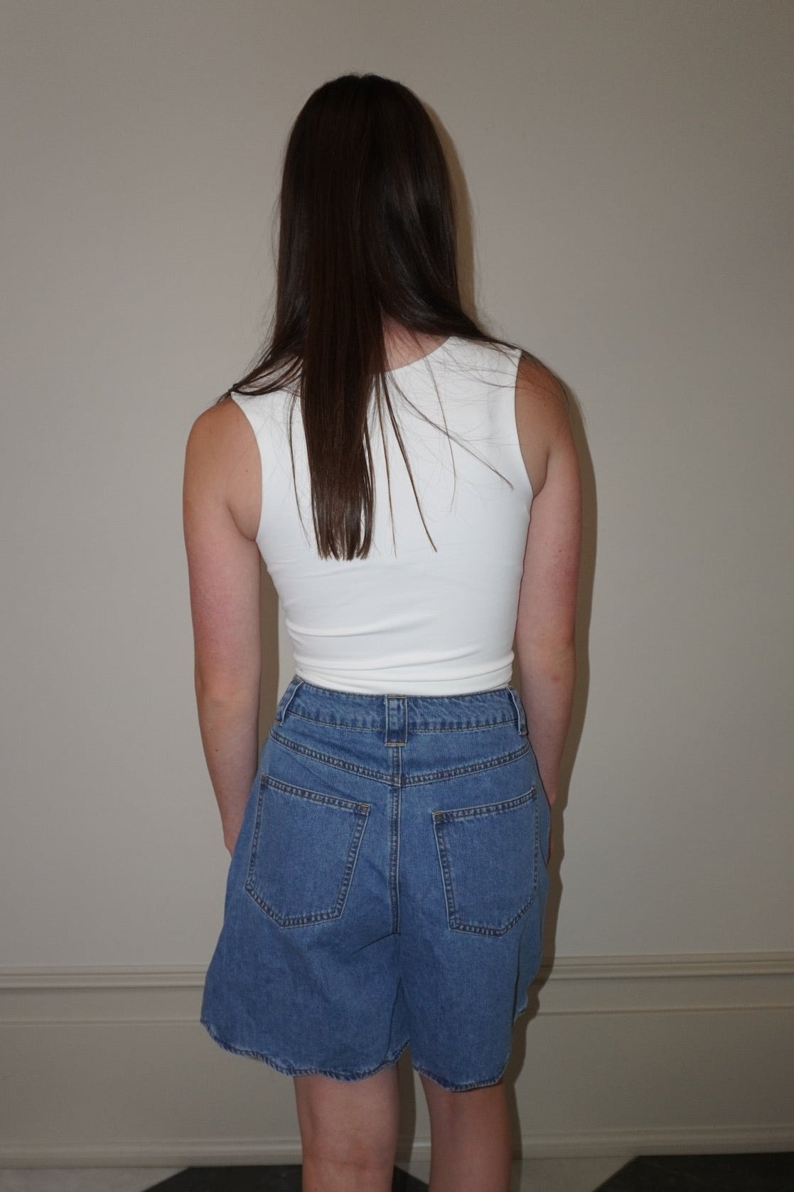 Bermuda called—and she brought a glow-up! These medium wash denim shorts put a fresh twist on the classic long-line fit with a looser, laid-back silhouette and the sweetest scalloped hem. They're comfy, cool, and just structured enough to keep things cute. Whether you're pairing them with a fitted tank or an oversized tee, these shorts serve effortless style with a side of “where’d you get those?” Finally, a pair that proves longer lengths can still bring major main character energy!