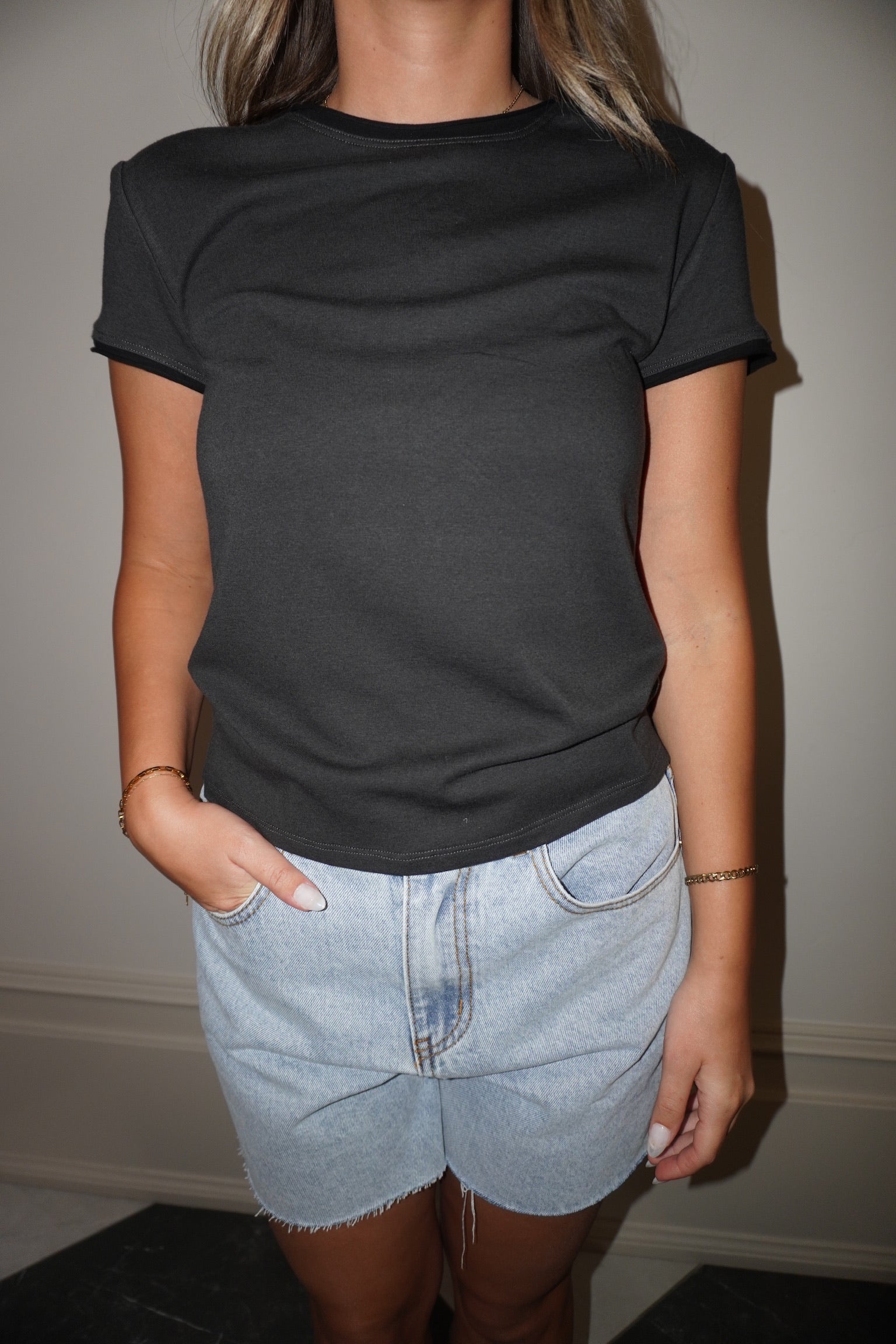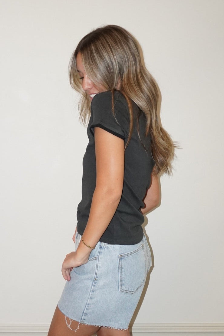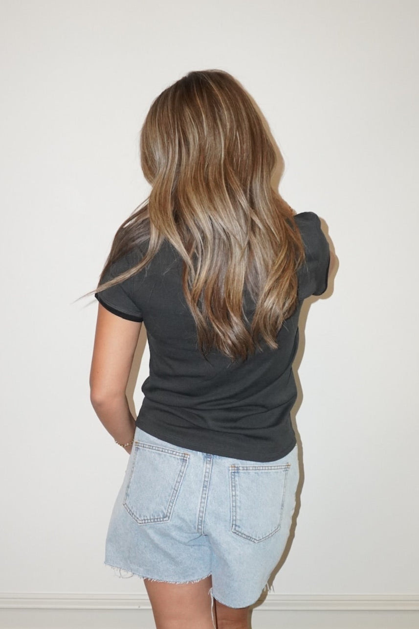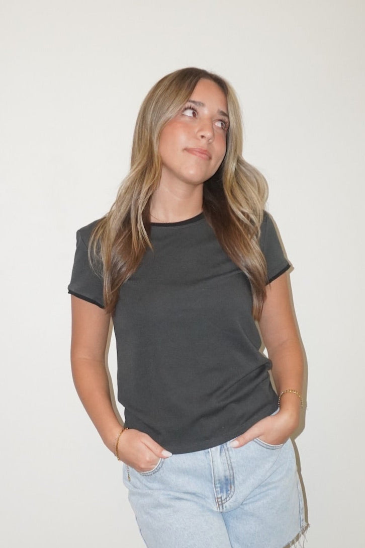 Like a front porch swing at golden hour or spiking your sweet tea—this tee takes a timeless look and adds just enough edge. The Tone On Tone Tee brings subtle western charm with a modern twist. In a washed-out dusty grey with bold black trim on the sleeves and collar, it’s got that lived-in, rodeo-watching-on-the-fencepost kind of feel. The slightly fitted silhouette and soft round neckline keep it flattering and easy to wear, whether you’re headed to the county fair or just out chasing the sunset. Throw it on with your favorite worn denim, a broken-in hat, and boots that’ve seen a dance floor or two. It's the kind of tee that says, “I didn’t try too hard—but I definitely showed up.”