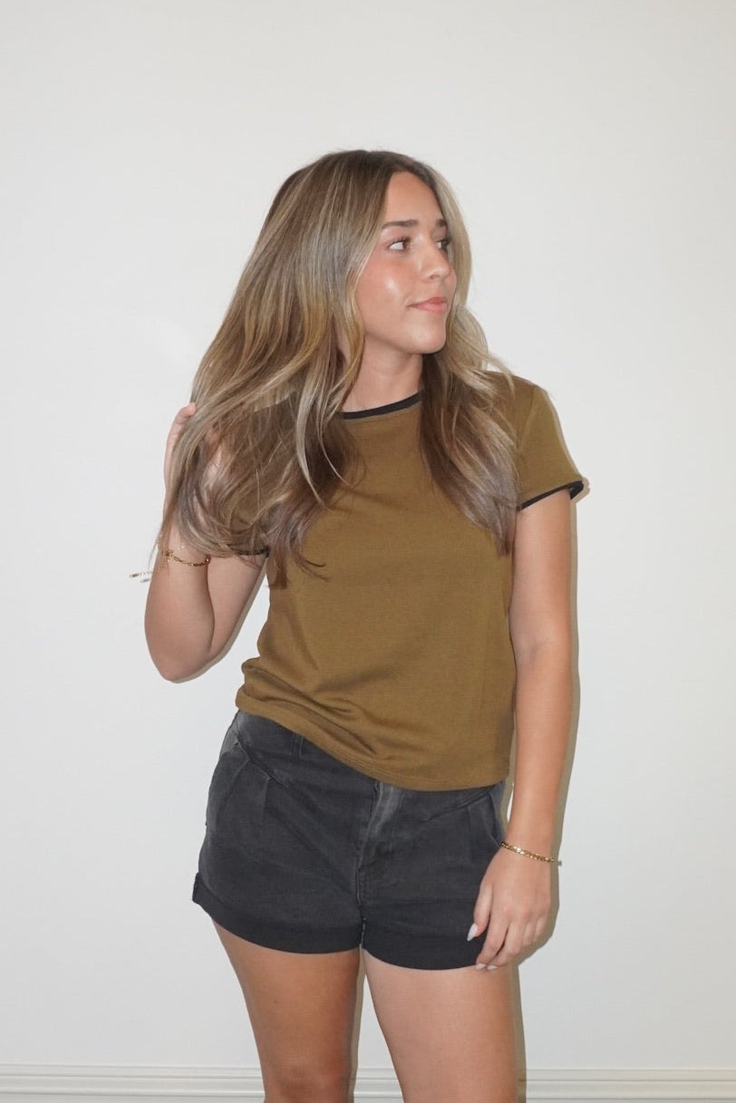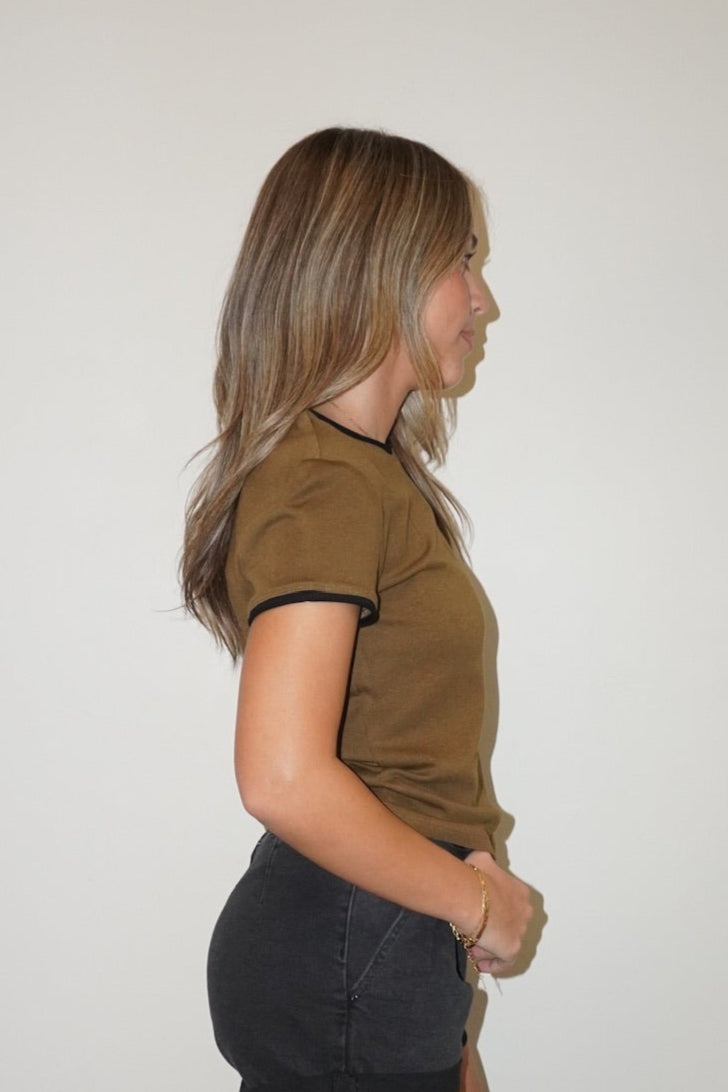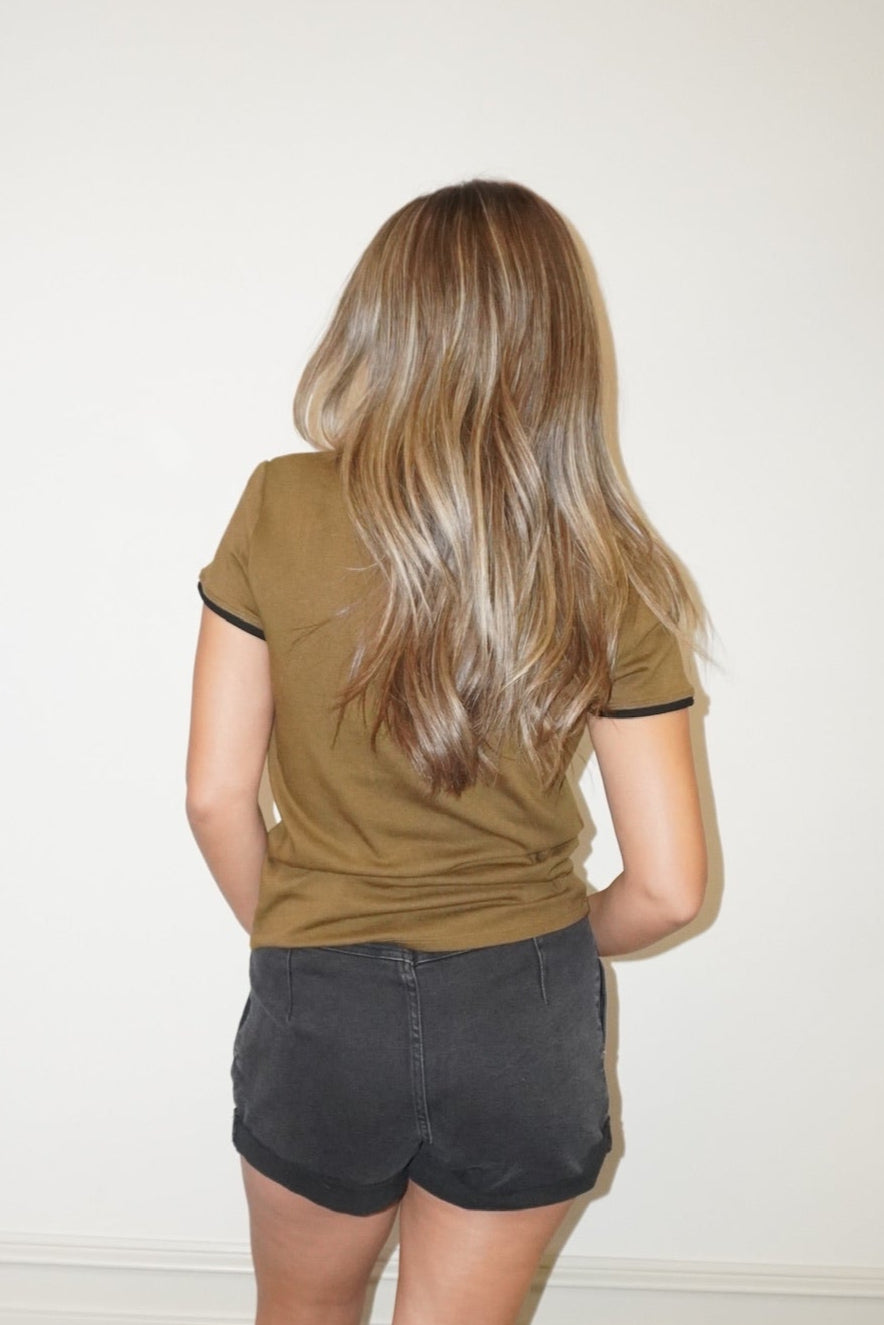 Tone Tee blends timeless charm with a touch of retro edge. Made in a flattering, slightly fitted silhouette, this mossy olive-green tee features a soft round neckline and contrasting charcoal edging on the sleeves and collar for that subtle statement moment. It’s giving "laid-back picnic in the shade" vibes—easy, effortless, and just polished enough to look like you planned it. Pair it with a basket, a baguette, and your favorite denim or midi skirt for that sweet spot between casual and chic. Who said sandwiches and style don't mix? Paired here with our Oat of Office Pants
