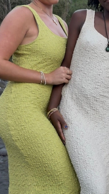 Ruched and Ready! Slip into something that does all the flirting for you. Our You Had Me at Aloha Midi Dress hugs your curves in all the right places with a sleek, ruched design, while the sleeveless tank cut and scoop neck keep it equal parts effortless and oomph. Tight-fitted and midi-length for maximum versatility—whether you're dressing it up with heels or throwing on sneakers for a casual slay, this dress is basically your new secret weapon. Available in three must-have shades—zesty lime green, timeless tan, and dreamy cream—because one just isn’t enough when the fit is this good!